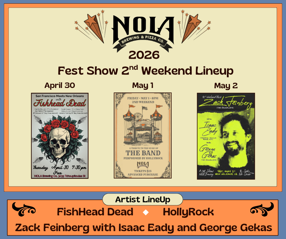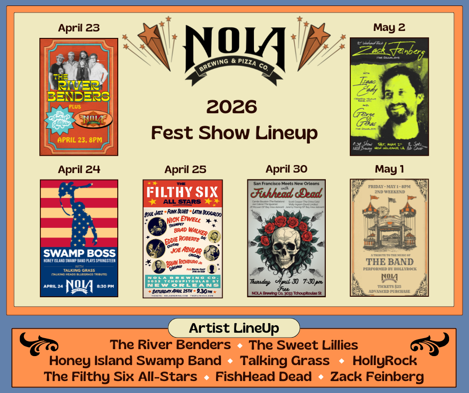 At NOLA Brewing & Pizza Co., a good time isn’t complete without great music. Each weekend, we host some of the best local talent—most shows are free, and when they’re not, tickets are among the most affordable in town. Come for the beer, stay for the pizza, and enjoy the music.